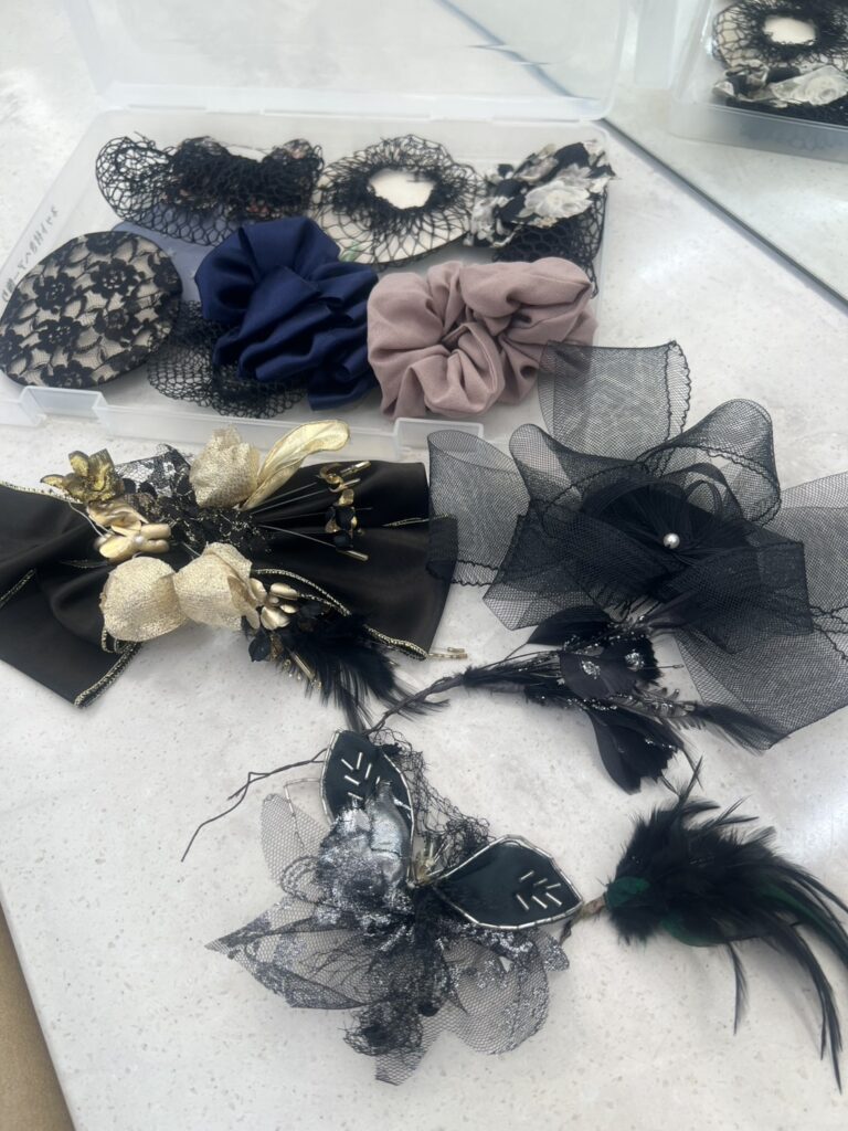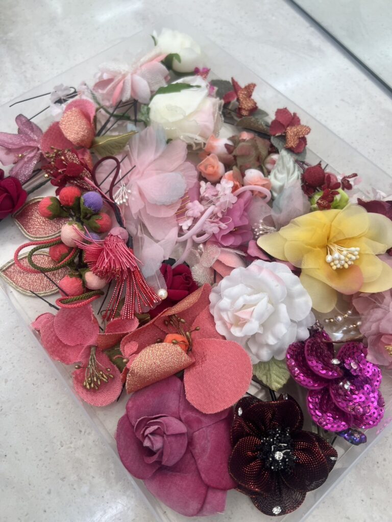 メイク室にはたくさんの髪飾りがあります。